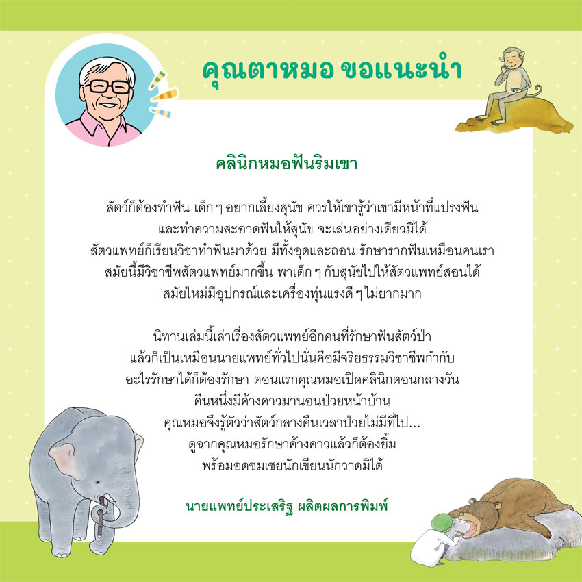 เรื่องย่อ : หมอพีมเปิดคลินิกหมอฟันริมเขา สัตว์ต่าง ๆ รู้เข้าก็พากันมารักษา ค้างคาวปวดฟัน แต่มาไม่ทันเวลาปิดสักที ค้างคาวปวดฟันมากขึ้น จนบินชนมาตลอดทาง หมอพีมเห็นถึงปัญหา จึงตัดสินใจปิดคลินิกให้ค่ำขึ้น เพื่อให้สัตว์กลางคืนได้มารักษาฟันด้วย