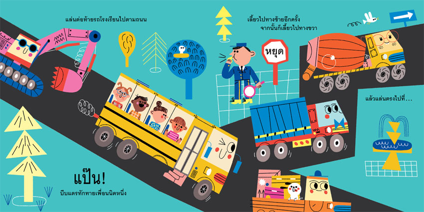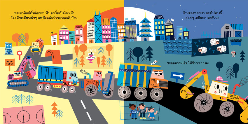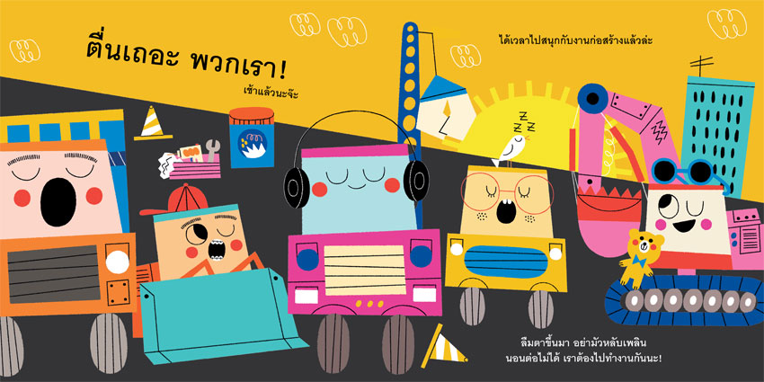 เรื่องย่อ : รถก่อสร้างตื่นแต่เช้า เติมพลังด้วยน้ำมัน แล้วออกเดินทางไปยังเขตก่อสร้าง รถแต่ละคันทำหน้าที่แตกต่างกันไป รถขุด รถตัก รถบด รถยก ฯลฯ ทำงานร่วมกันอย่างสามัคคีและขยันขันแข็ง จนงานต่างๆ สำเร็จด้วยดีทุกวัน เมื่อเลิกงานแล้ว ก็เดินทางกลับที่พัก อาบน้ำ ทำความสะอาด แล้วพักผ่อน ก่อนที่จะตื่นขึ้นมาอย่างเบิกบาน แล้วออกไปทำงานในวันต่อไป